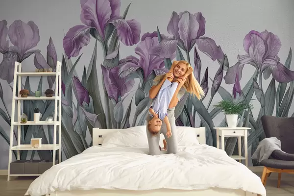 Fototapeten Große rosa Schwertlilien auf einer weißen Betonwand N° w07949v1