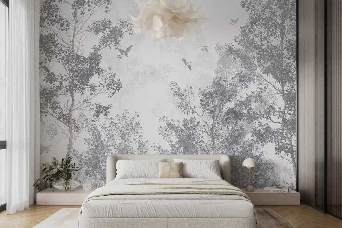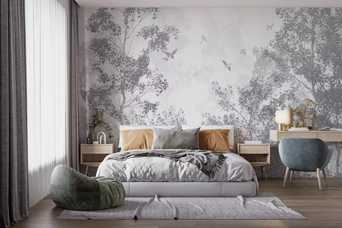 Fototapeten Bäume mit grauen Blättern und Zweigen mit Vögeln fliegen in den Himmel, weißer Hintergrund N° w07982v1