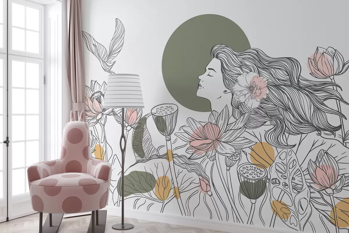 Fototapeten Frau in der Natur, Strichzeichnung, Lotusblumen, große Blätter, fliegende Vögel, Pastellfarben N° w07988v6