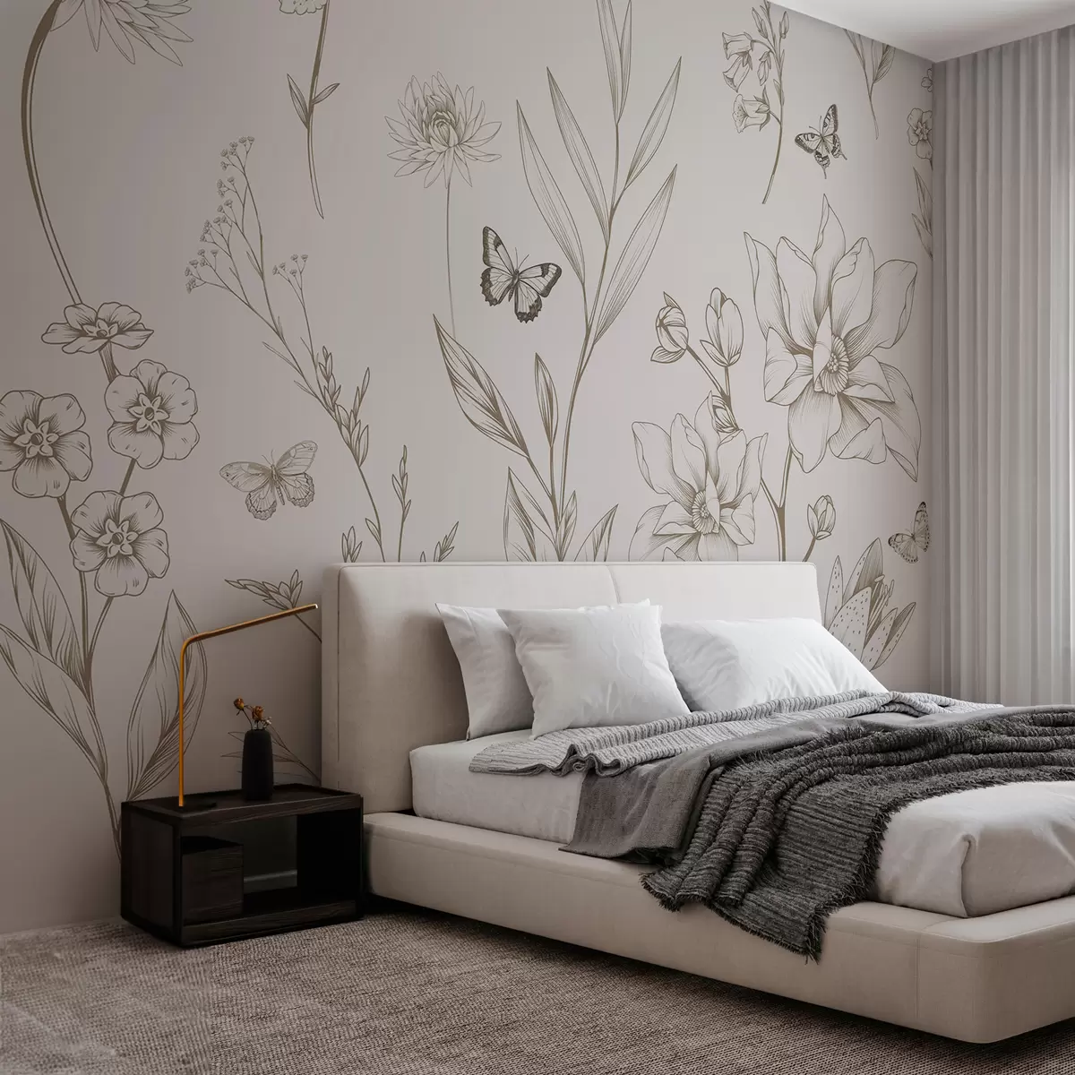 Fototapeten Boho Monochrome Blumen und Schmetterlinge in Beige N° w08088v1