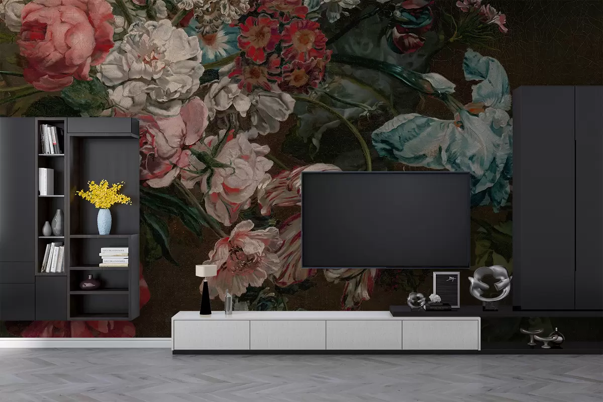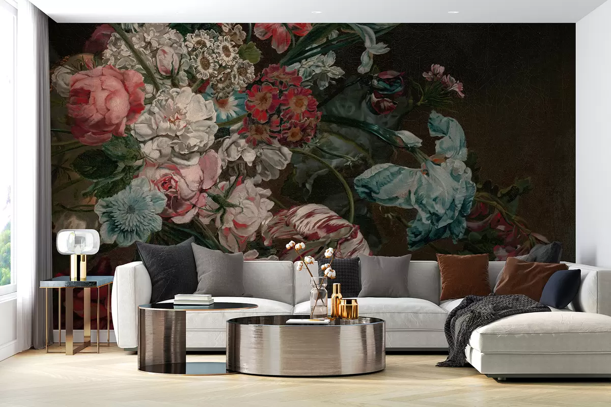 Fototapeten Vintage bunte Blumen, darunter rosa Pfingstrosen, rote Nelken und weiße Lilien vor einem dunklen Hintergrund N° w08163
