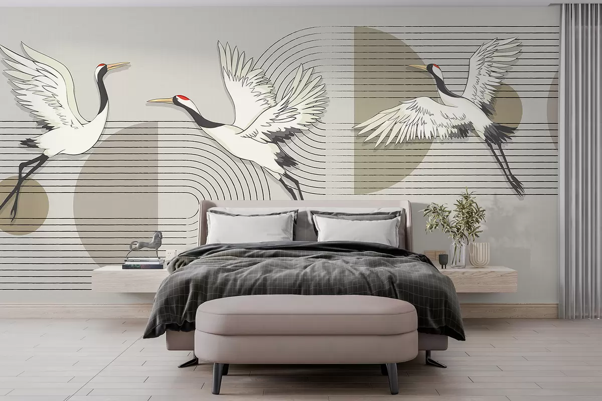 Fototapeten Drei weiße Kraniche im Flug vor einem geometrischen minimalistischen Hintergrund mit konzentrischen Kreisen N° w08188