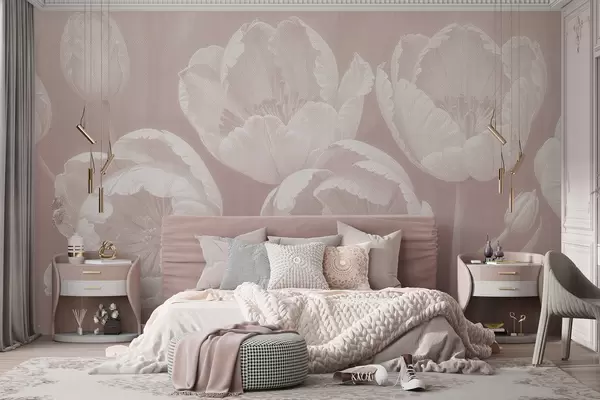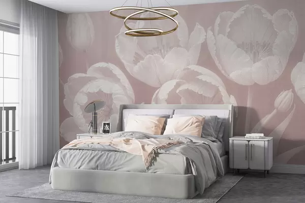 Fototapeten Zeichnung von weißen Tulpen mit weichem, strukturiertem beigefarbenem unscharfem Hintergrund auf Leinwand, minimalistischer monochromer Druck N° w08193