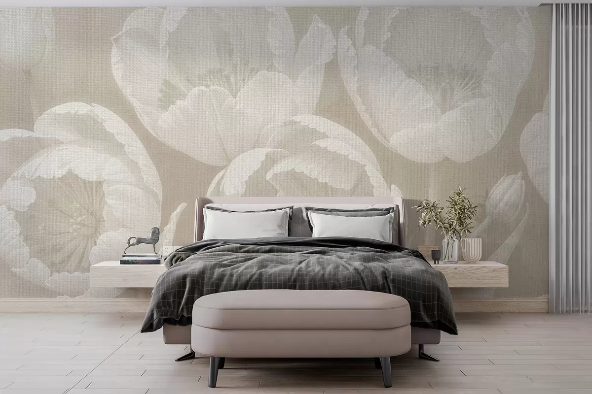 Fototapeten Zeichnung von weißen Tulpen mit weichem, strukturiertem rosa unscharfem Hintergrund auf Leinwand, minimalistischer monochromer Druck N° w08193v1