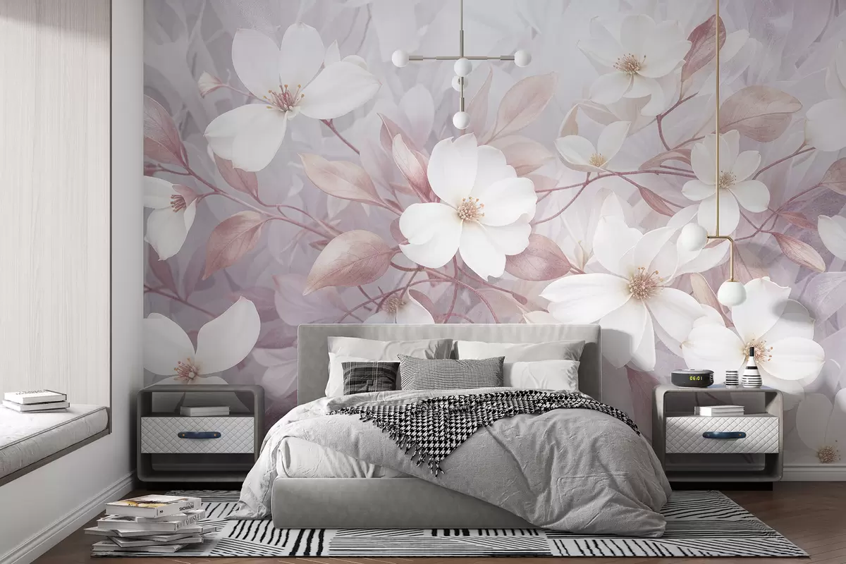 Fototapeten Zarte rosa und weiße Magnolienblüten blühen auf weichen, verschwommenen Zweigen vor einem blassen Hintergrund N° w08196