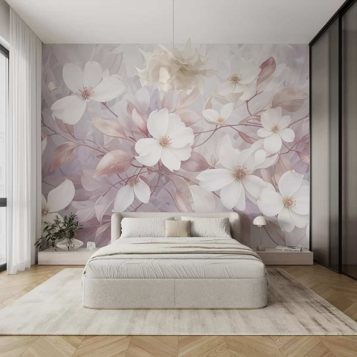 Fototapeten Zarte rosa und weiße Magnolienblüten blühen auf weichen, verschwommenen Zweigen vor einem blassen Hintergrund N° w08196