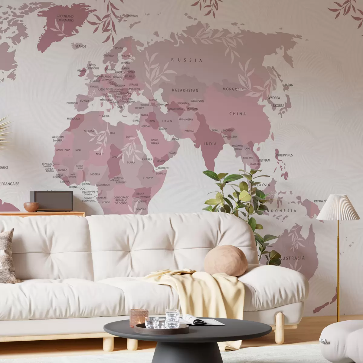 Fototapeten Stilvolle Weltkarte mit Blättern und Pflanzen in rosa Farbe N° w08211v3