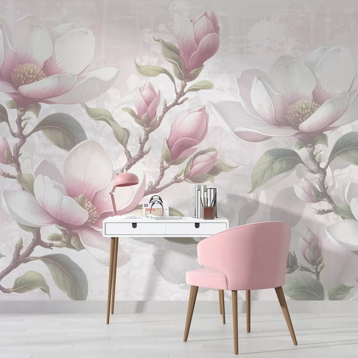 Fototapeten Zarte rosa Magnolienblüten in voller Blüte vor einem weichen, unscharfen Hintergrund N° w08216