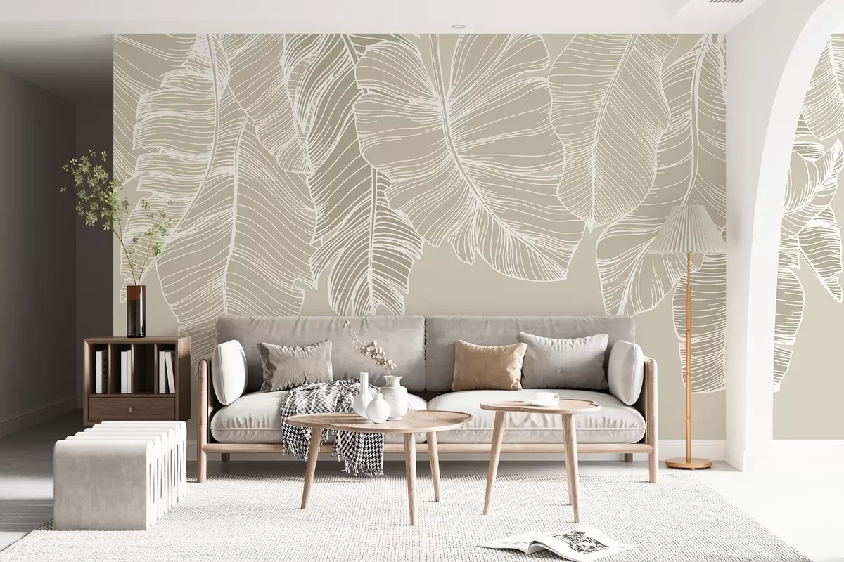 Fototapeten Weiße tropische Blumenblätter mit hellbeigem Hintergrund, minimalistisches Line-Art-Design N° w08235
