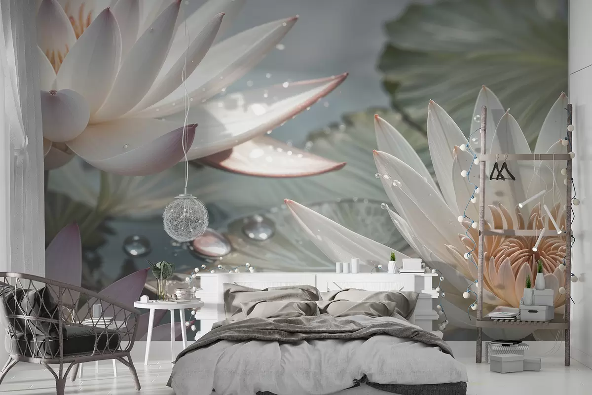 Fototapeten Eine Nahaufnahme von weißen Lotusblumen mit Wassertropfen auf ihren Blütenblättern vor einem unscharfen grünen Hintergrund N° w08252