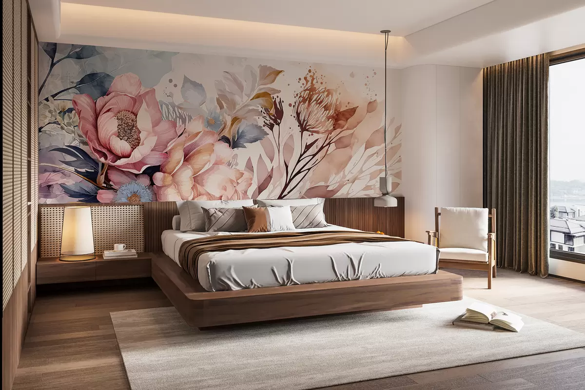 Fototapeten Große rosa und blaue Blumen mit zarten Blütenblättern, umgeben von kleineren Blumen vor einem Aquarellhintergrund N° w08256
