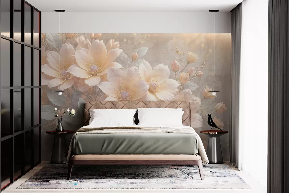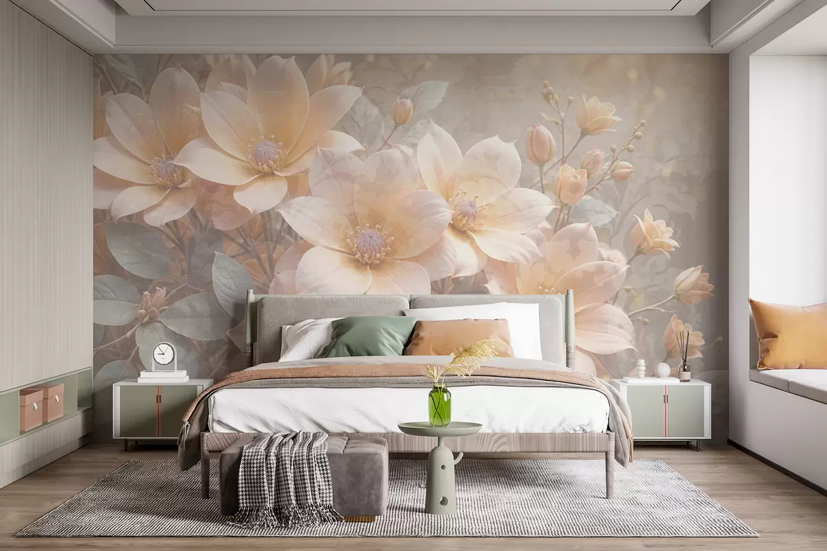 Fototapeten Pastellfarbene Blumen mit zarten Blütenblättern vor einem unscharfen, strukturierten Hintergrund, der eine heitere Atmosphäre schafft N° w08273