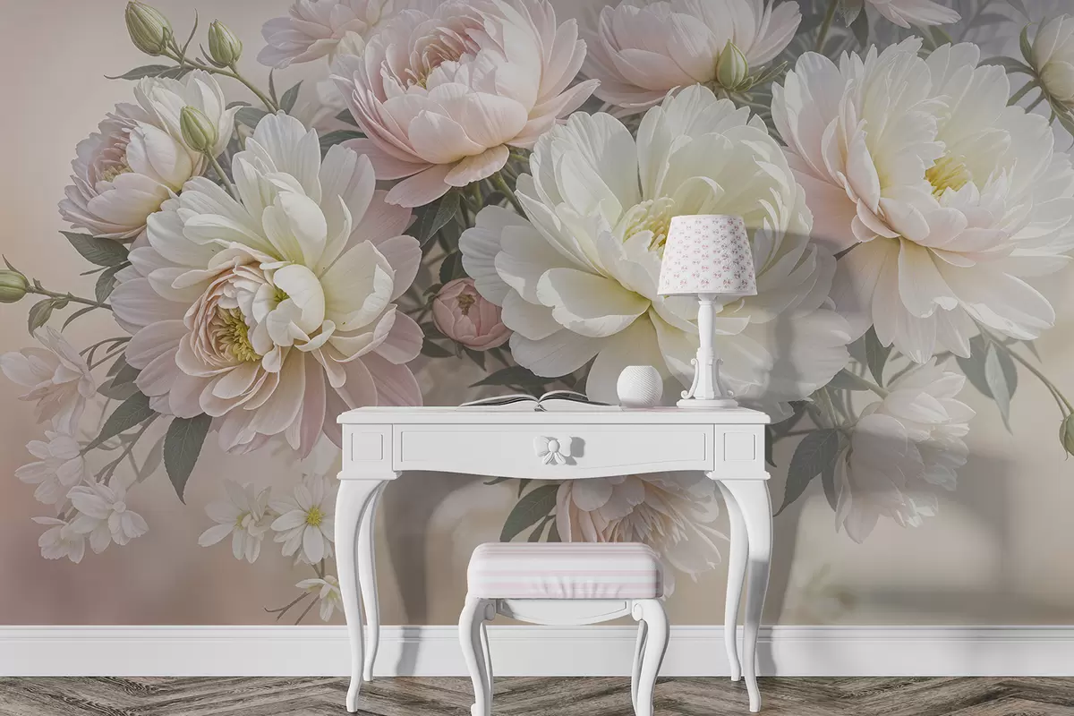 Fototapeten Ein Blumenstrauß aus üppigen, pastellfarbenen Pfingstrosen und anderen Blumen vor einem weichen, unscharfen Hintergrund N° w08276
