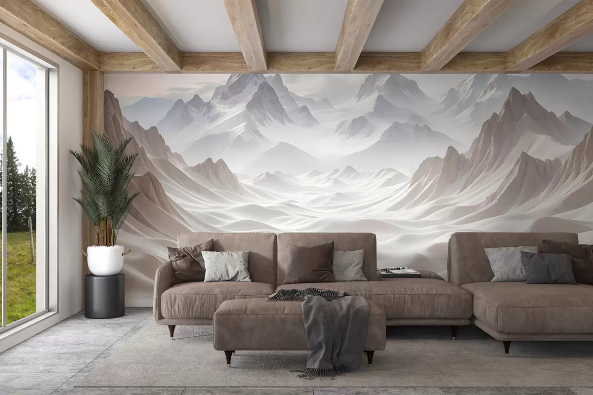 Fototapeten Schneebedeckte Berggipfel, die aus einer nebligen, ätherischen Landschaft mit sanften Hügeln und Tälern herausragen N° w08313