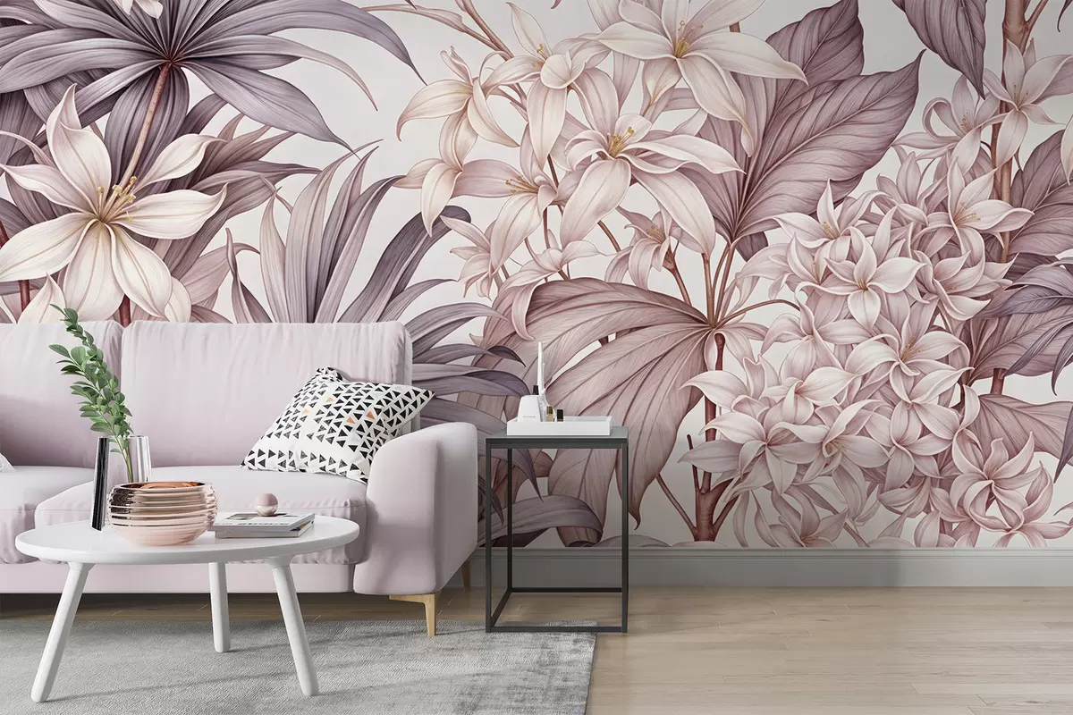 Fototapeten Ein tropischer Blumendruck mit großen weißen und hellrosa Blüten, Bordürenblättern und einem neutralen Hintergrund N° w08318v1