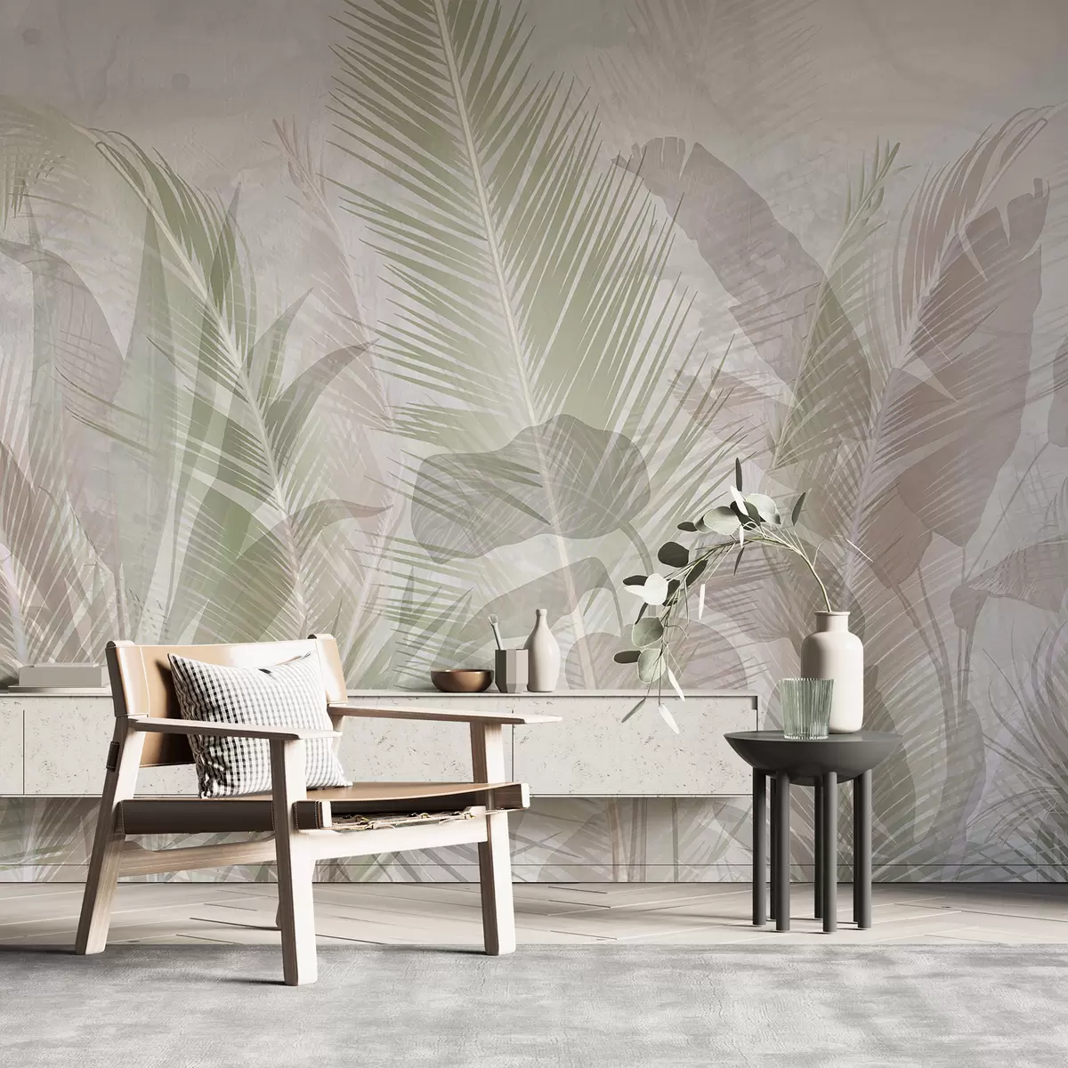 Fototapeten Tropische Palmenblätter in sanften Pastellfarben, mit einem unscharfen und dunstigen strukturierten Hintergrund N° w08326