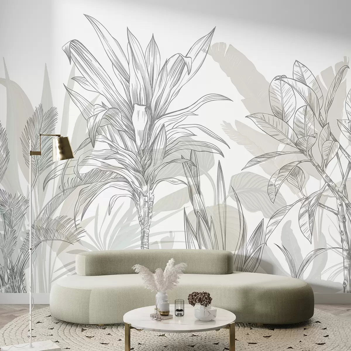 Fototapeten Eine tropische Pflanzengrafik mit großen, üppigen Blättern und Blüten in Grau- und Weißtönen mit grünen Blumensilhouetten N° w08327