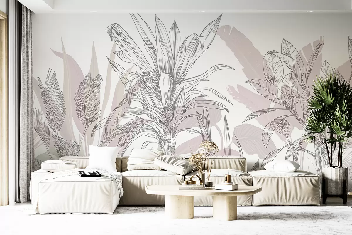 Fototapeten Eine tropische Pflanzengrafik mit großen, üppigen Blättern und Blüten in Grau- und Weißtönen mit rosafarbenen Blumensilhouetten N° w08327v1