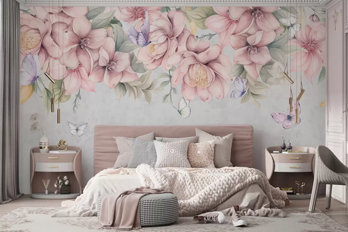 Fototapeten Zarte rosa und weiße Blumen mit zarten Blüten und Blättern auf strukturiertem grauem Hintergrund N° w08331