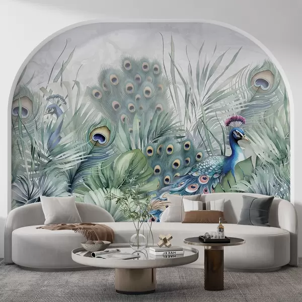 Fototapeten Ein Paar bunte Pfauen umgeben von üppigen Aquarell grünes Laub und lebendige Blumen auf grauem Hintergrund N° w08345