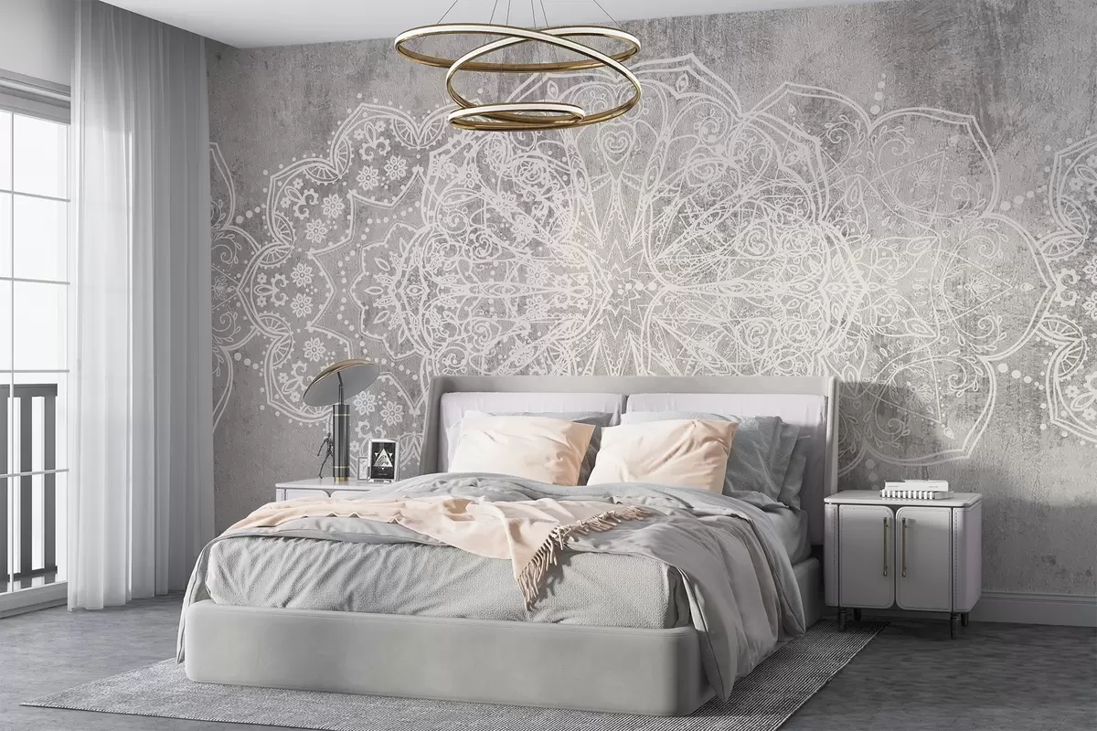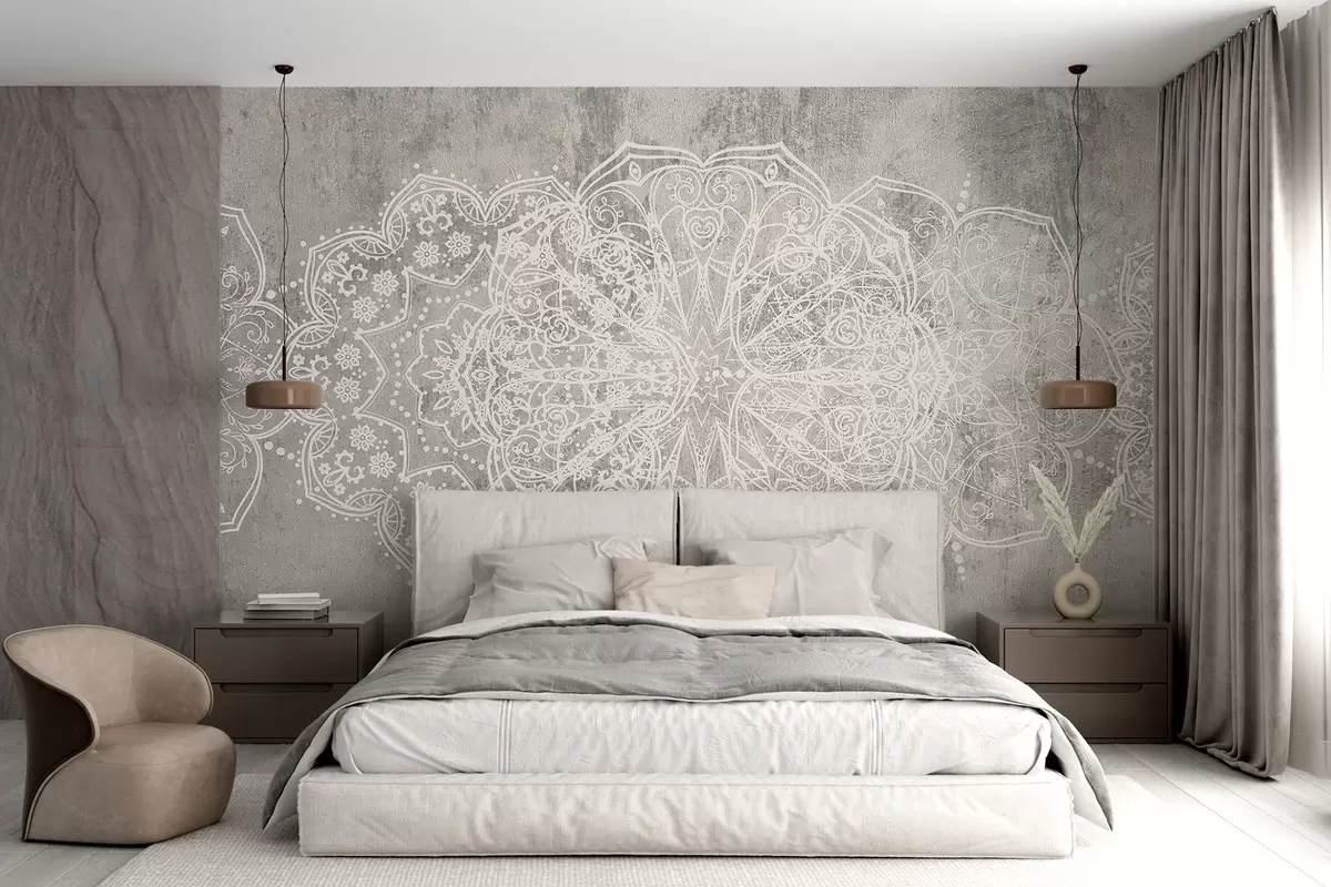 Fototapeten Ein detailliertes, kompliziertes Mandala-Muster aus weißer Spitze auf einem strukturierten, grauen Wandhintergrund N° w08387