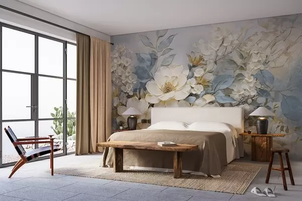 Fototapeten Strukturierte große weiße und blassgelbe Blüten mit graugrünen Blättern vor einem weichen, verschwommenen Hintergrund N° w08404