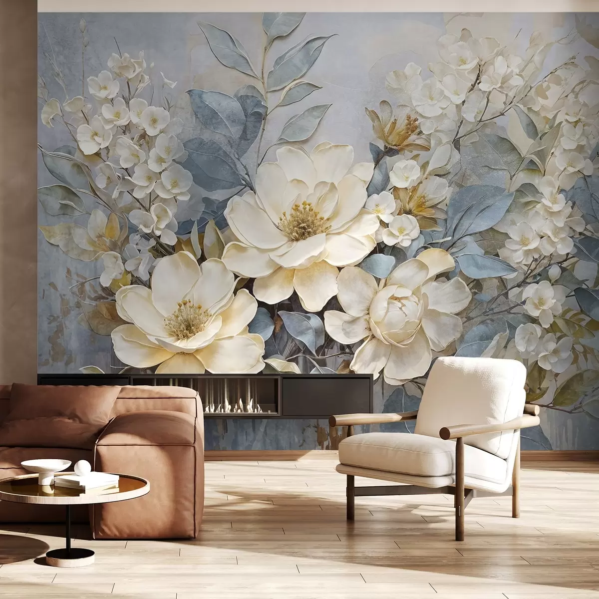 Fototapeten Strukturierte große weiße und blassgelbe Blüten mit graugrünen Blättern vor einem weichen, verschwommenen Hintergrund N° w08404