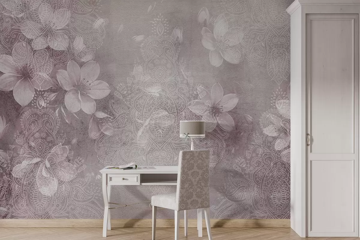 Fototapeten Soft-Fokus-Zeichnung von zarten weißen Blumen auf einer unscharfen strukturierten Spitze bordo Hintergrund N° w08405v2