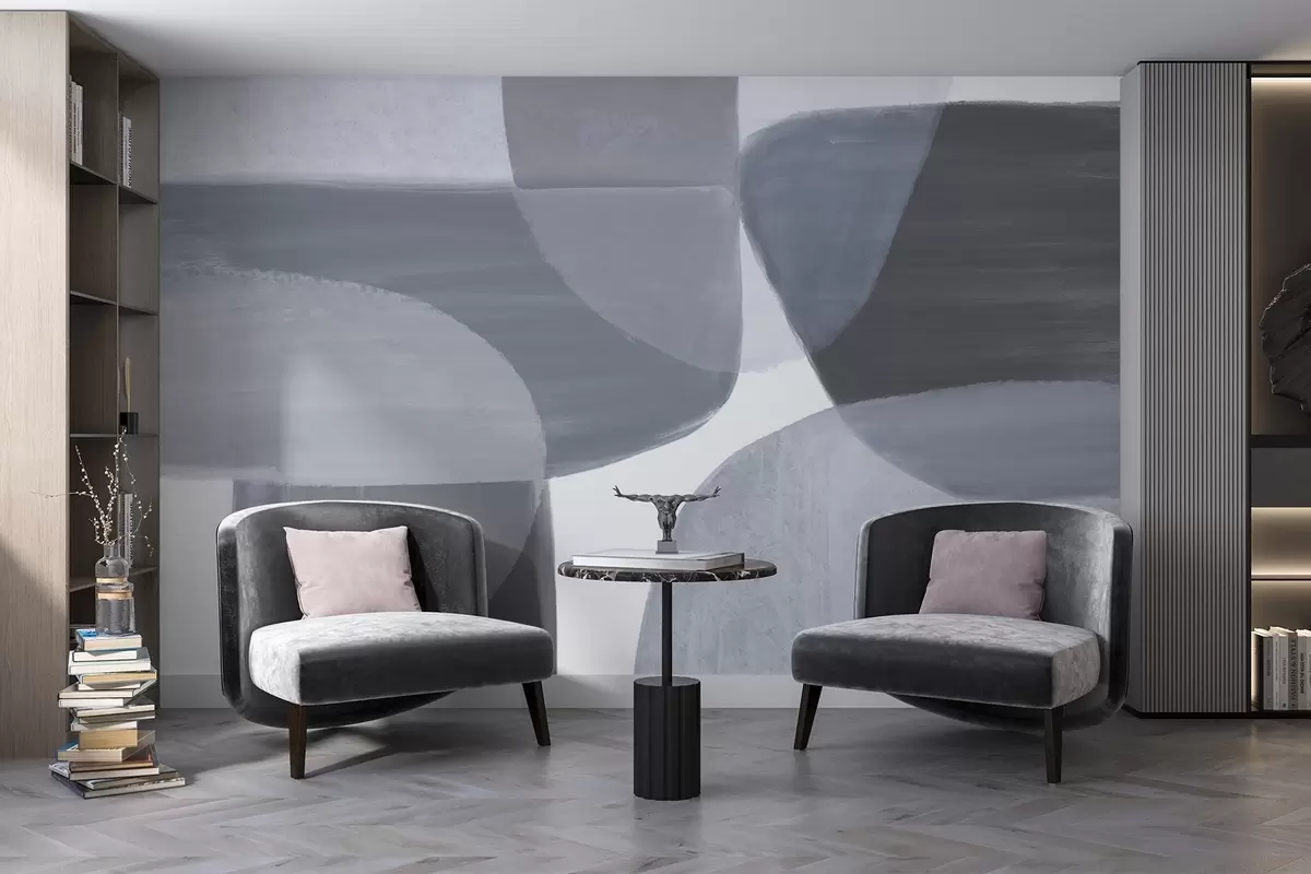Fototapeten Ein monochromer abstrakter Druck mit sich überschneidenden minimalistischen Formen in Grau- und Blautönen N° w08410