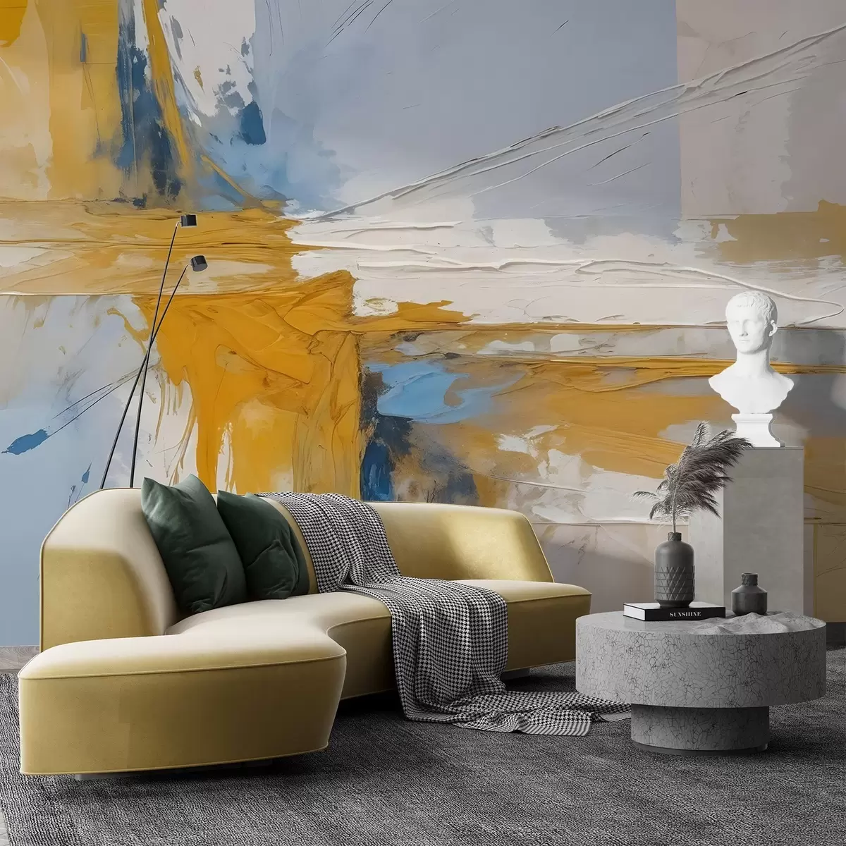 Fototapeten Minimalistische abstrakte Kunstkomposition mit kräftigen Pinselstrichen in gelber, blauer und weißer Farbe N° w08414