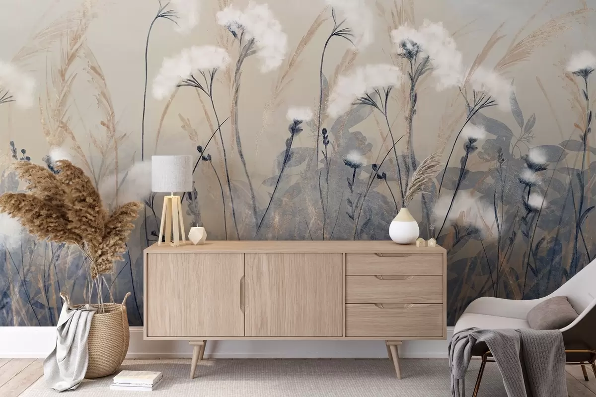 Fototapeten Flauschiges weißes Baumwollgras vor einem unscharfen, strukturierten Hintergrund mit einer weichen, dunstigen und heiteren Atmosphäre N° w08416