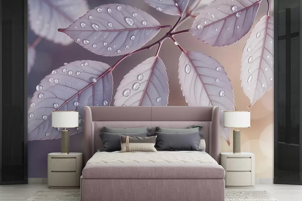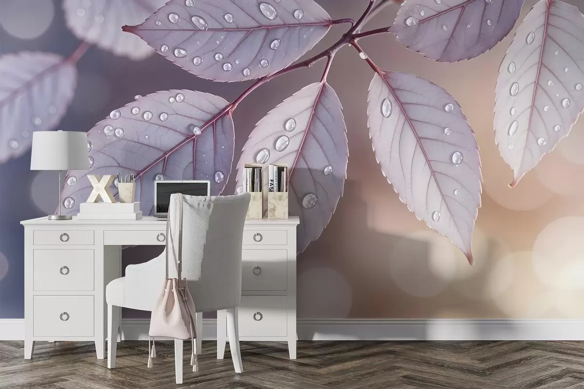 Fototapeten Zarte lila Blätter mit Wassertropfen, Weichzeichner Hintergrund N° w08419