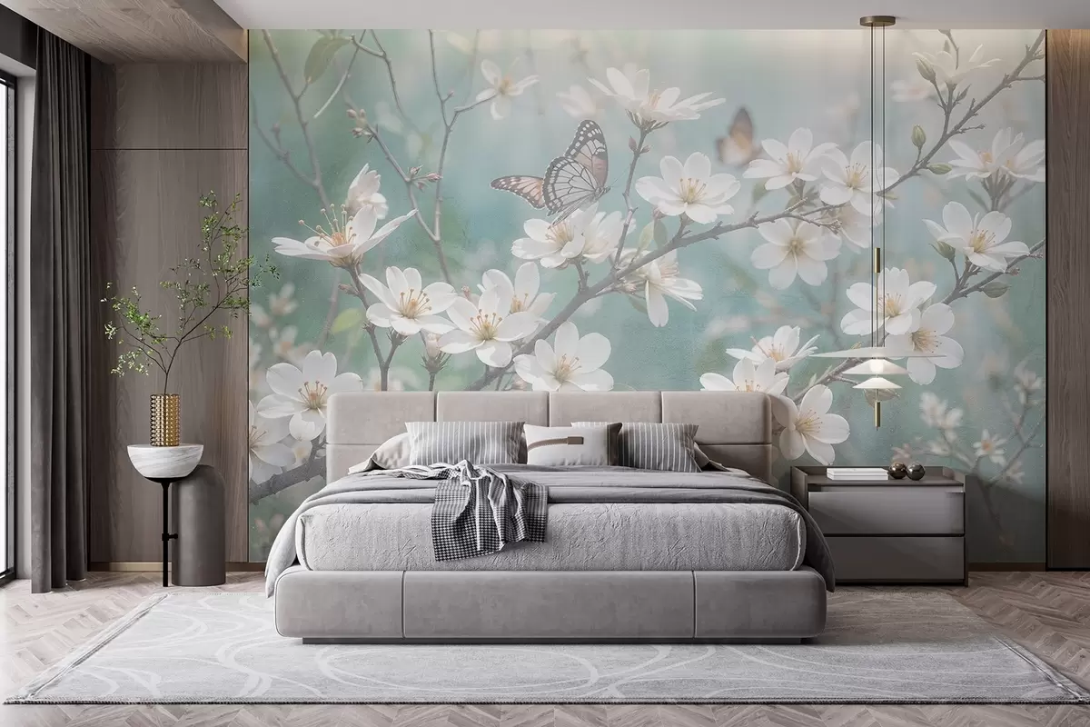 Fototapete Ein weißer Schmetterling auf einem Zweig mit zarten weißen Kirschblüten im Vordergrund vor einem unscharfen Hintergrund w08421
