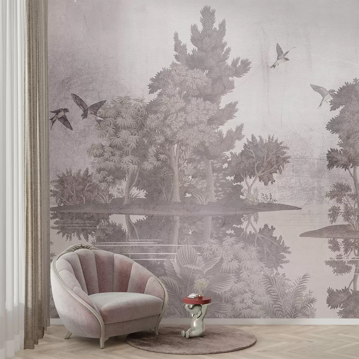 Fototapeten Eine Waldlandschaft mit einem See, umgeben von Kiefern und anderem Laub auf einem beigefarbenen Hintergrund mit Struktur N° w08426