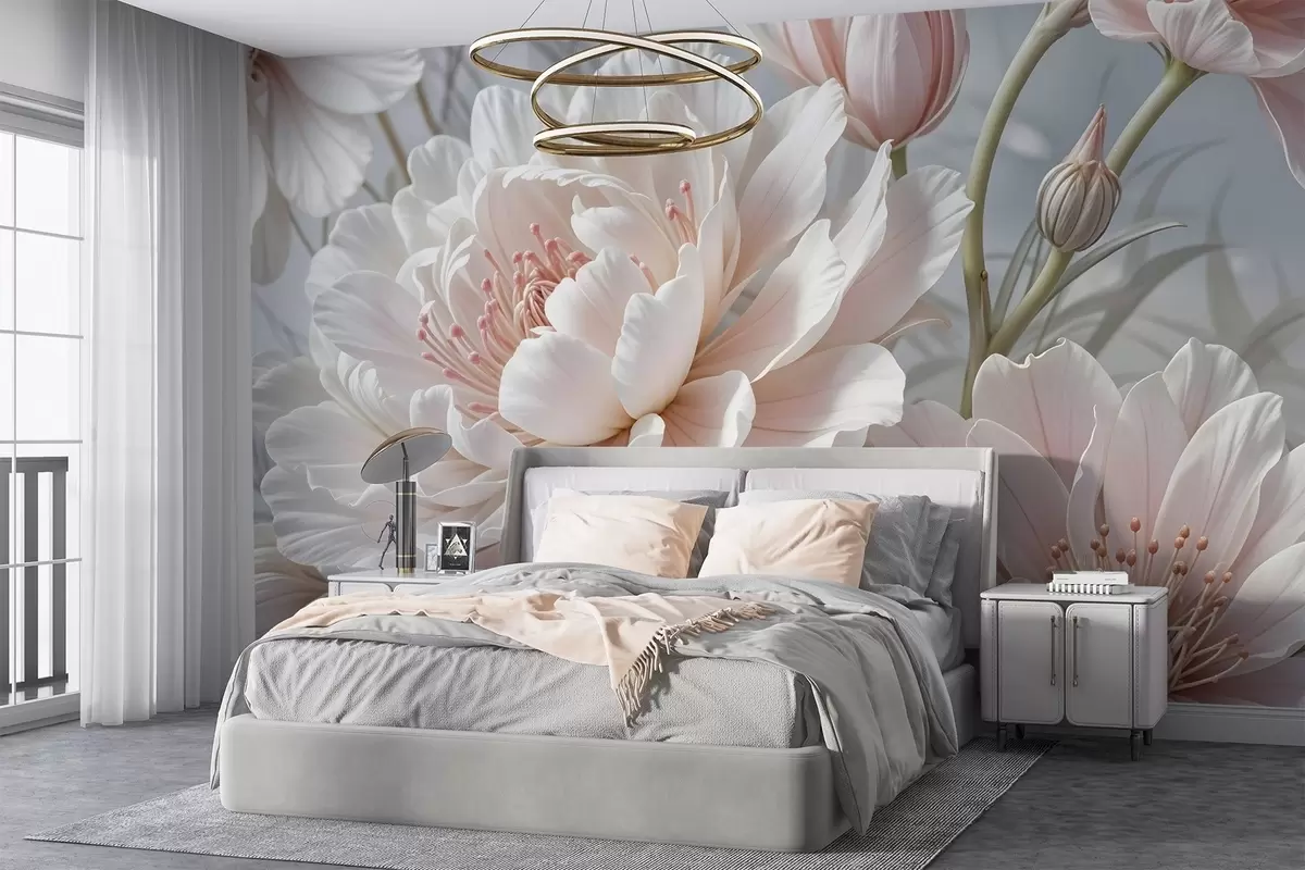 Fototapeten Große, zarte weiße und rosa Pfingstrosenblüten mit weichen, flauschigen Blütenblättern vor einem unscharfen grauen Hintergrund N° w08427