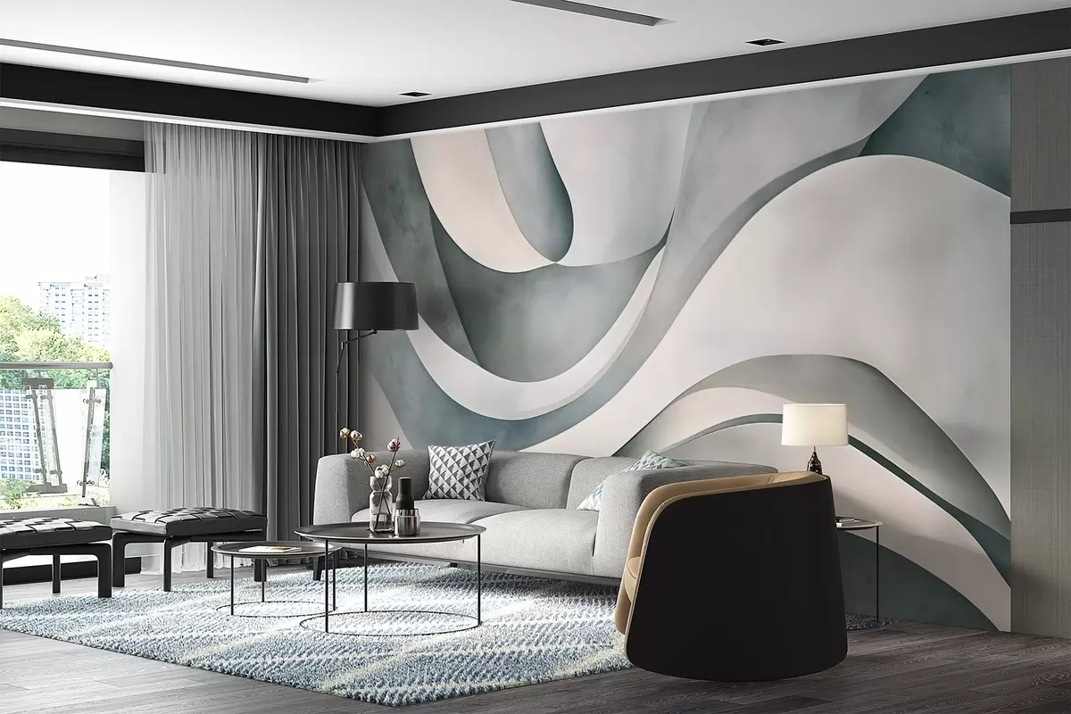 Fototapeten Weiße, blaue und graue geschwungene Formen, die einen abstrakten, texturierten, modernen und minimalistischen Druck erzeugen N° w08439v1