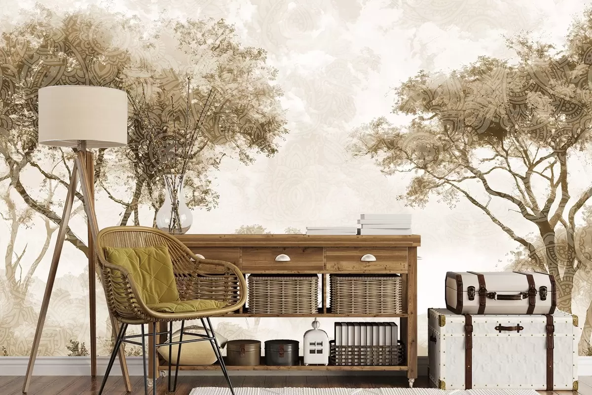Fototapeten Eine neblige, heitere Landschaft mit silhouettierten Bäumen im Vordergrund und weichem Nebel in Braun- und Beigetönen N° w08442v2