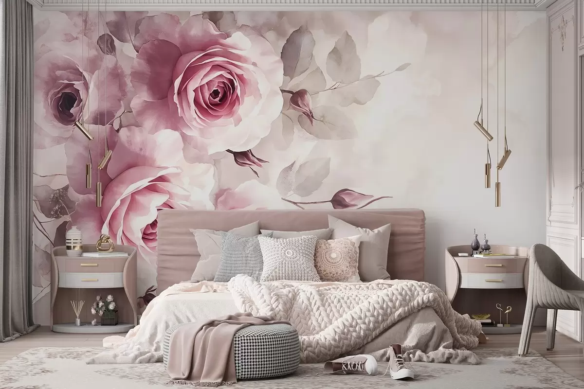Fototapeten Zarte pastellrosa Rosen und Blätter mit weichem, verschwommenem Aquarellimitationshintergrund N° w08459