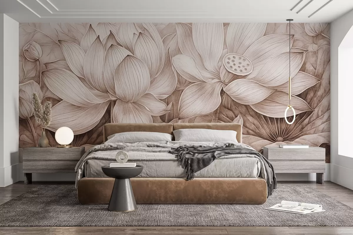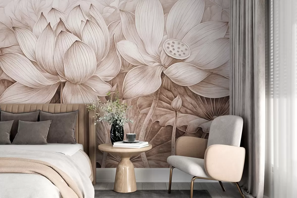 Fototapete Mehrere detailliert strukturierte große beigefarbene Lotusblumen mit braunen Blättern und Stängeln vor hellem Hintergrund w08465v1