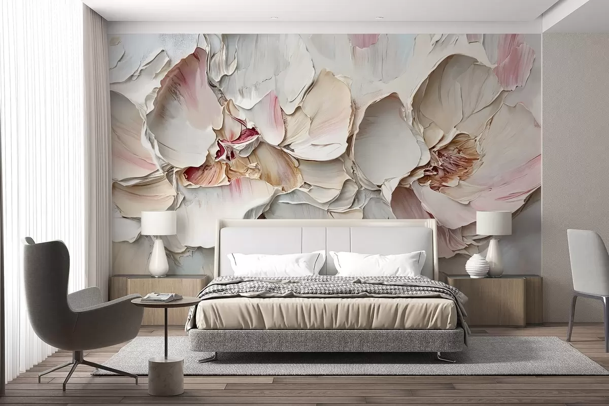 Fototapeten Zarte, blassrosa Blüten mit weichen, geschichteten Blütenblättern auf einem gedämpften, strukturierten Hintergrund Impasto-Ölgemälde-Imitation N° w08467