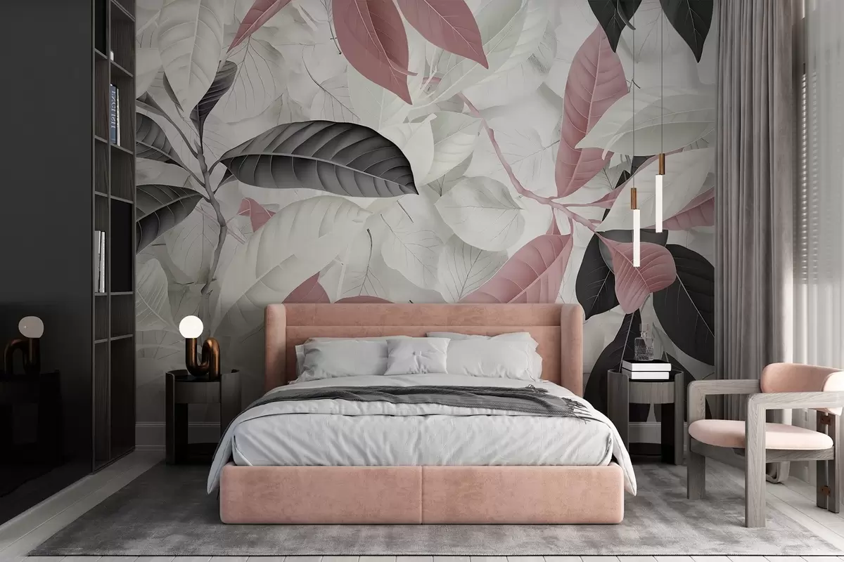 Fototapeten Großer Druck von rosafarbenen und grauen Blättern vor einem hellen, strukturierten Hintergrund, der ein üppiges tropisches Gefühl vermittelt N° w08468