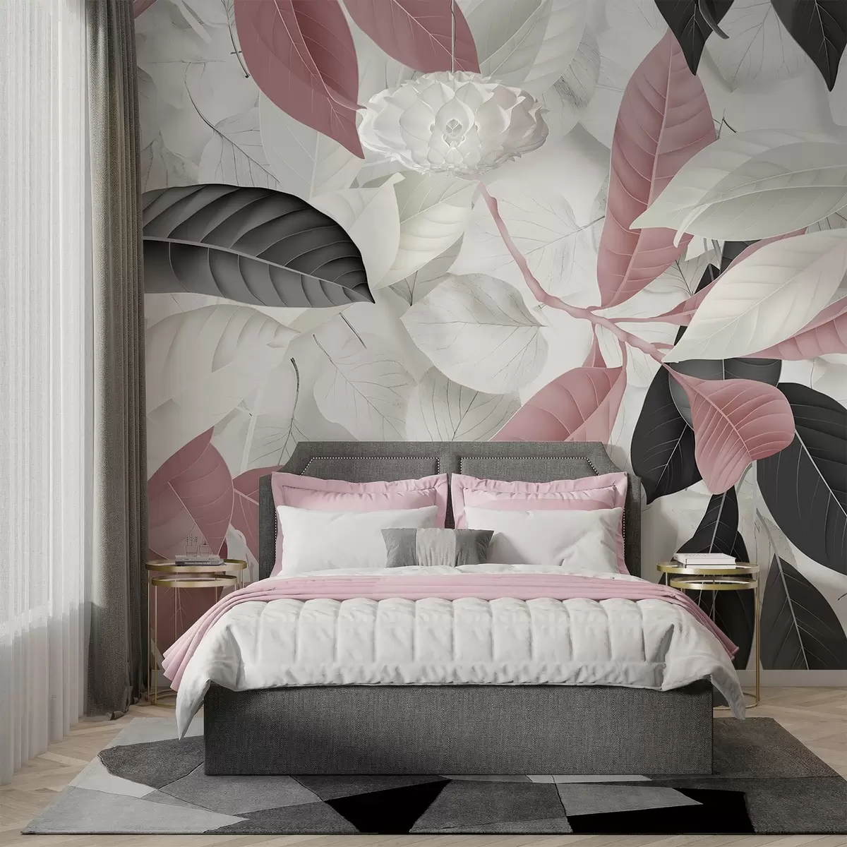 Fototapeten Großer Druck von rosafarbenen und grauen Blättern vor einem hellen, strukturierten Hintergrund, der ein üppiges tropisches Gefühl vermittelt N° w08468