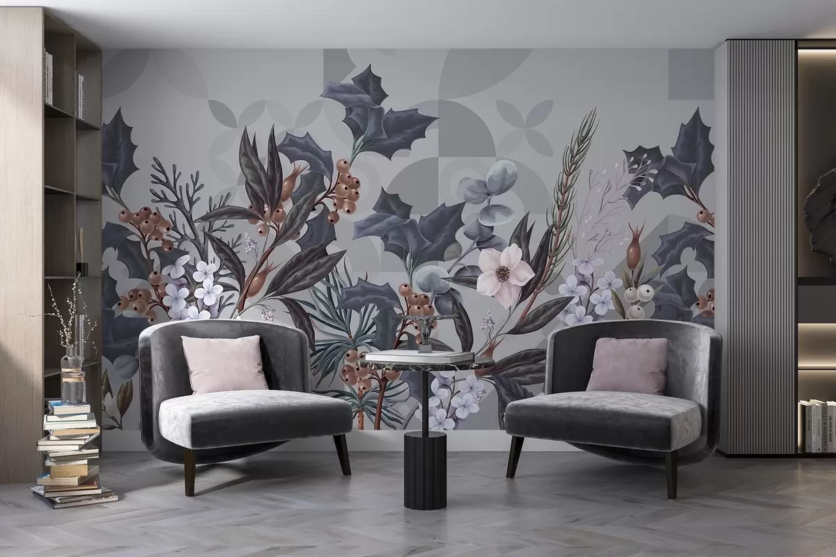Fototapeten Florales Arrangement mit großen dunklen Blättern, Blumen und Beeren auf einem gedämpften grauen geometrischen abstrakten Hintergrund N° w08525