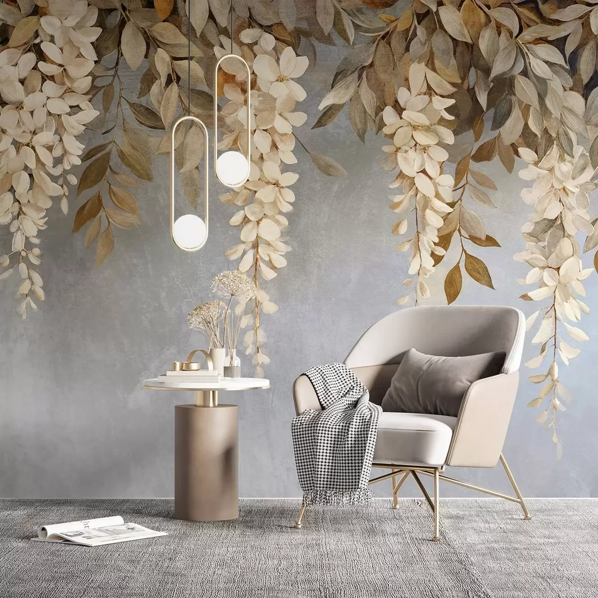 Fototapeten Zarte weiße und hellbeige Glyzinienblüten mit kaskadenartig herabfallendem Laub vor zartgrauem Hintergrund N° w08531