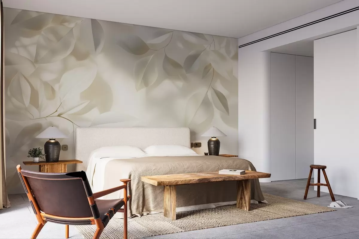 Fototapeten Hängende weiße Zweige mit Blättern gegen eine Wand mit Sonnenlicht N° w08552
