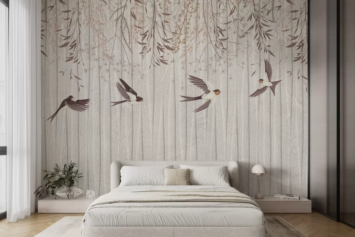 Fototapeten Fliegende Vögel auf einem strukturierten Hintergrund mit Löwenzahn und Blumen N° w08566
