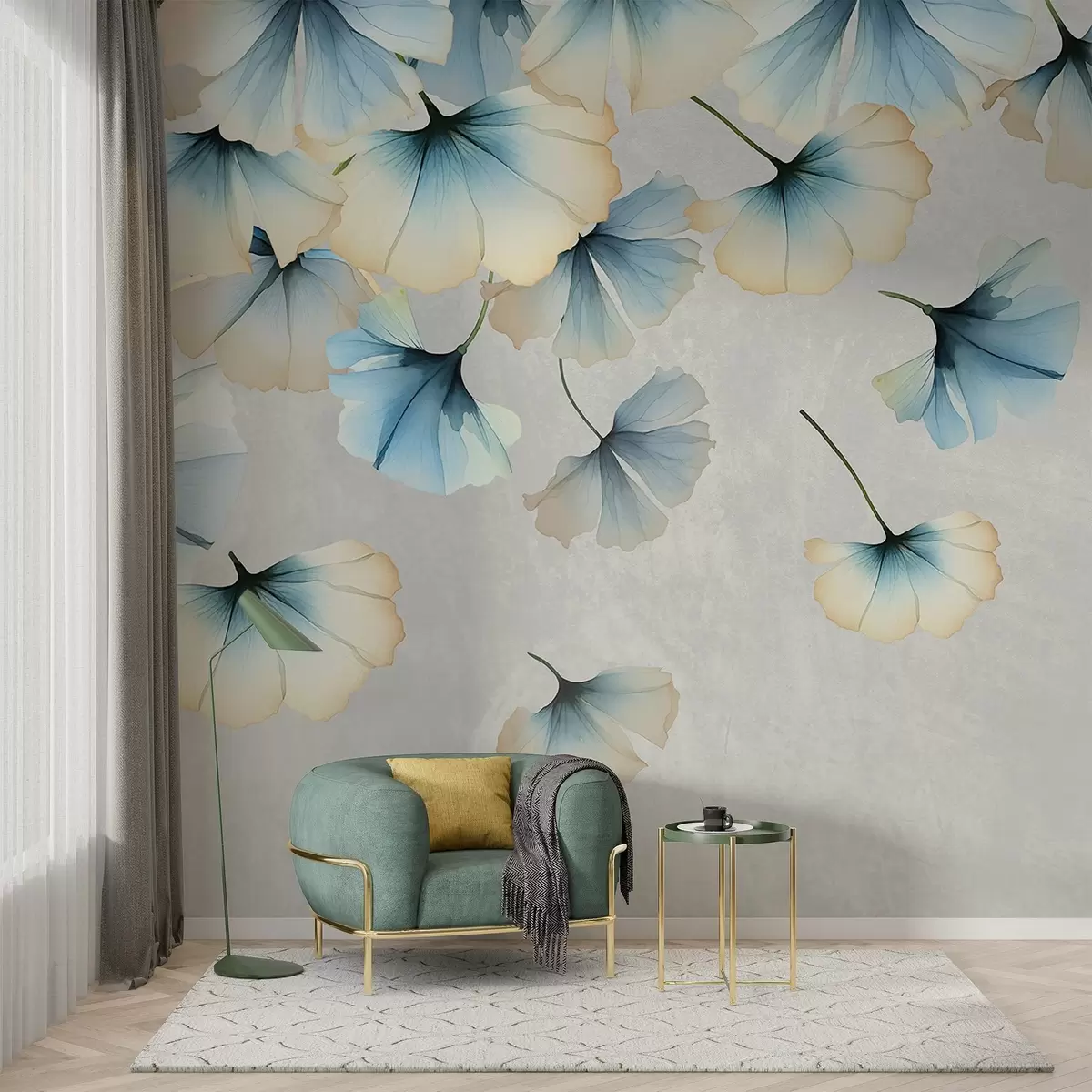 Fototapeten Pastellfarbene blaue und gelbe Ginkgoblätter mit zarten, in der Luft schwebenden Blütenblättern vor einem strukturierten Hintergrund N° w08578v1