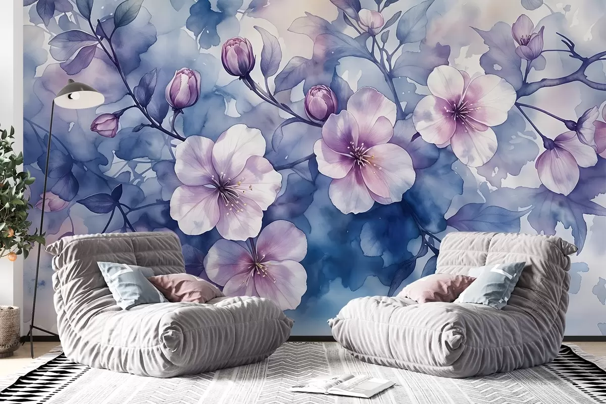 Fototapeten Zarte Aquarell-Imitation von rosa und lila Blumen mit weichen, verschwommenen Blütenblättern vor einem blauen Hintergrund mit Sprenkeln N° w08582