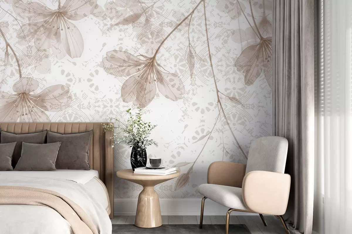Fototapeten Zarte beigefarbene und weiße Blüten mit langen Stielen und Blütenblättern vor einem weichen, verschwommenen, strukturierten Hintergrund N° w08588v1