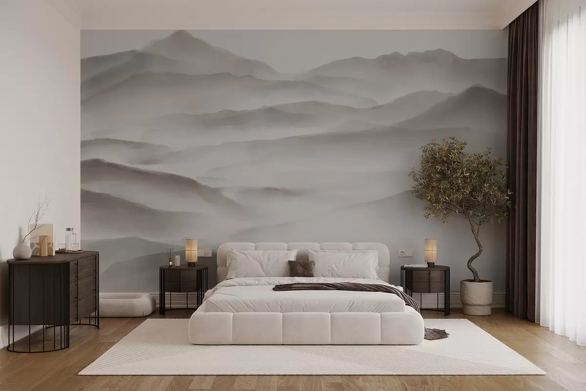 Fototapeten Minimalistische Gebirgslandschaft mit sanften Hügeln und Nebel, die einen ruhigen und stimmungsvollen Druck erzeugen N° w08602
